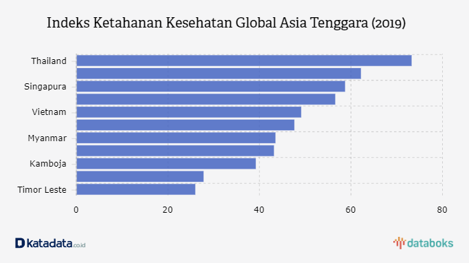 Skor rata-rata indeks ketahanan kesehatan global sebesar 40,2 poin. Indeks ketahanan kesehatan global Thailand menjadi juara di Asia Tenggara. Negeri Gajah Putih itu mengumpulkan 73,2 poin dari skala 0 hingga 100. Thailand menempati posisi keenam dunia.
