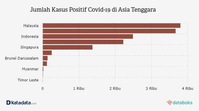 Kemudian, Indonesia berada di peringkat tiga dengan hampir 2,5 ribu kasus. Thailand dan Singapura pun mencatatkan ribuan kasus positif Covid-19, yakni 2,2 ribu kasus dan 1,4 ribu kasus.