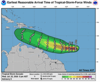 This graphic shows the earliest reasonable time for the arrival of tropical storm-force winds, 39 mph or greater, as Gonzalo moves into the Caribbean Sea.