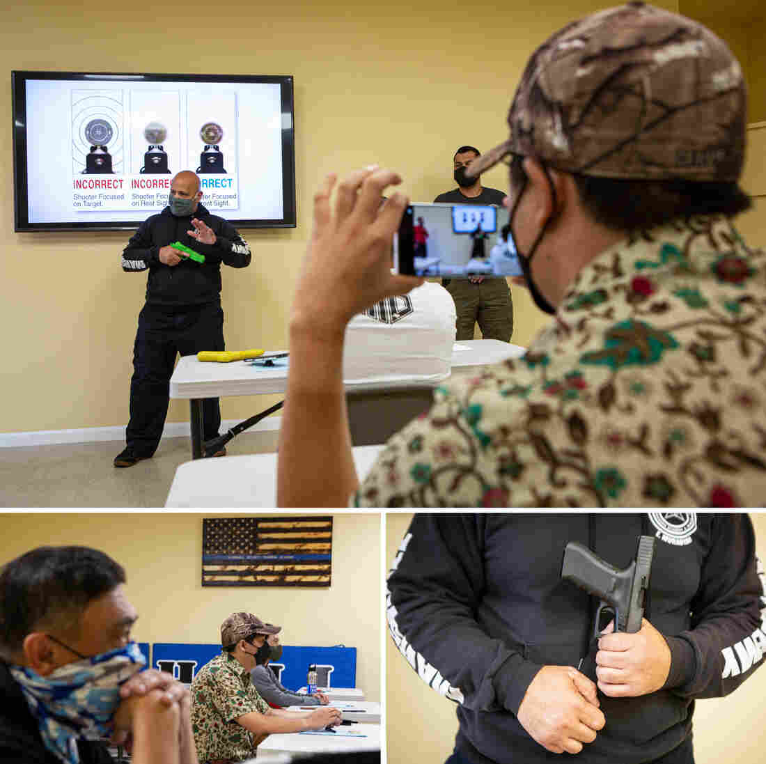 Top: Sunha Kim records Edmon Muradyan as he demonstrates safety during the firearms training course. Bottom left: Participants in the firearms training course. Bottom right: Muradyan demonstrates safety during the training course. Jane Hahn for NPR