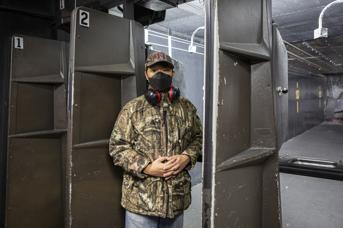Jae Chung, 49, stands for a portrait outside the Marshall Security Training Academy & Range. Jane Hahn for NPR