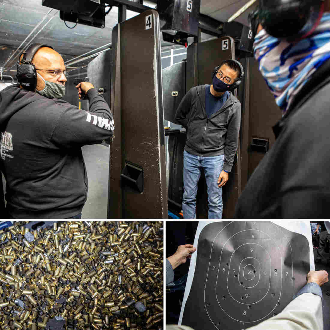 Top: Owner and instructor Edmon Muradyan, 46, instructs Jae Chung, 49, and Anthony Refuerzo, 61, during a firearms training course organized by Asian Americans for Asian Americans at the Marshall Security Training Academy & Range in Compton, Calif. Bottom left: Bullet casings in the shooting range. Bottom right: A participant shows her paper target after her first time at a shooting range. Jane Hahn for NPR