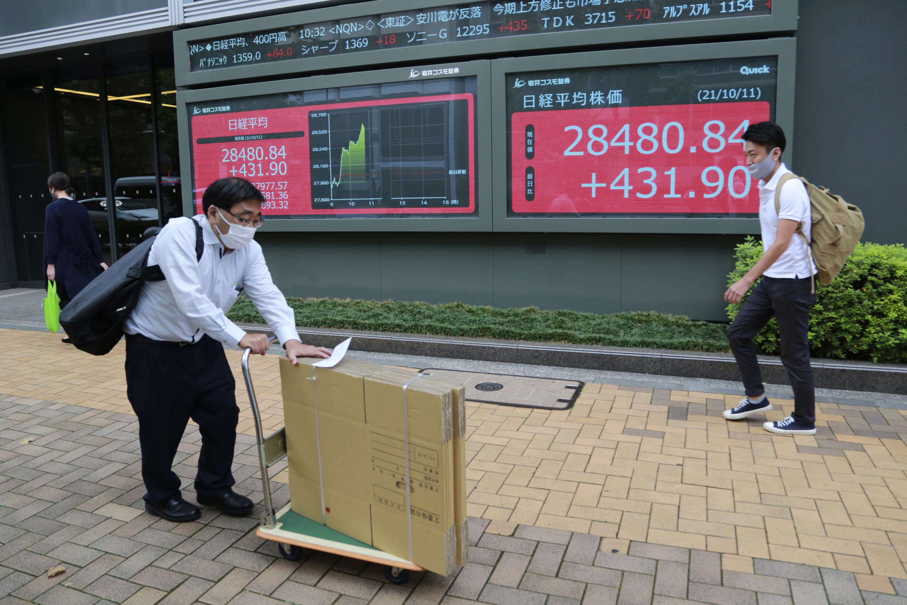 In Asian trading on Monday, Tokyo’s benchmark Nikkei 225 jumped 1.6% to finish at 28,498.20 after Japan’s new prime minister, Fumio Kishida, backed away from comments suggesting he favored raising taxes on capital gains and dividends. The possibility of such an increase had spooked investors after he took office on Oct. 4.