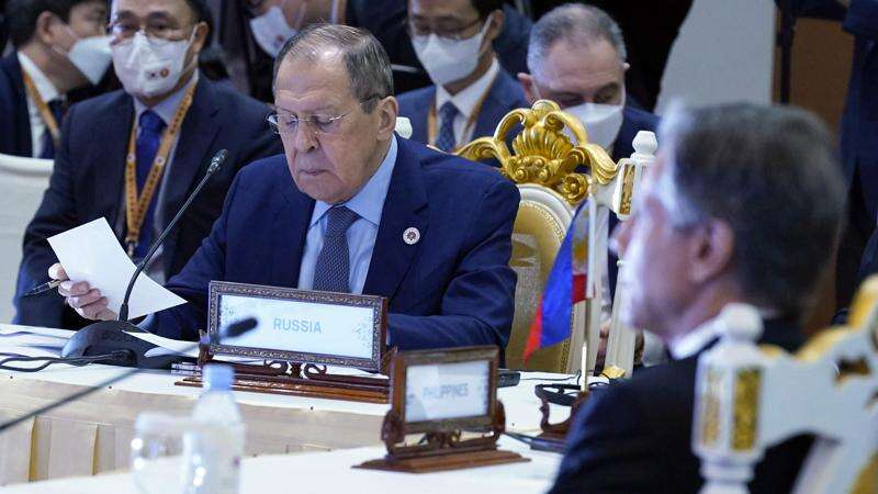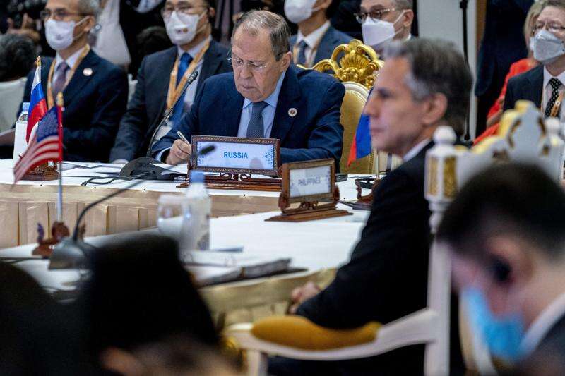 Secretary of State Antony Blinken, right, and Russian Foreign Minister Sergey Lavrov, center, are seated close together during an east Asia summit foreign ministers meeting at Sokha Hotel in Phnom Penh, Cambodia, Friday, Aug. 5, 2022. Blinken is on a ten day trip to Cambodia, Philippians, South Africa, Congo, and Rwanda. (AP Photo/Andrew Harnik, Pool)